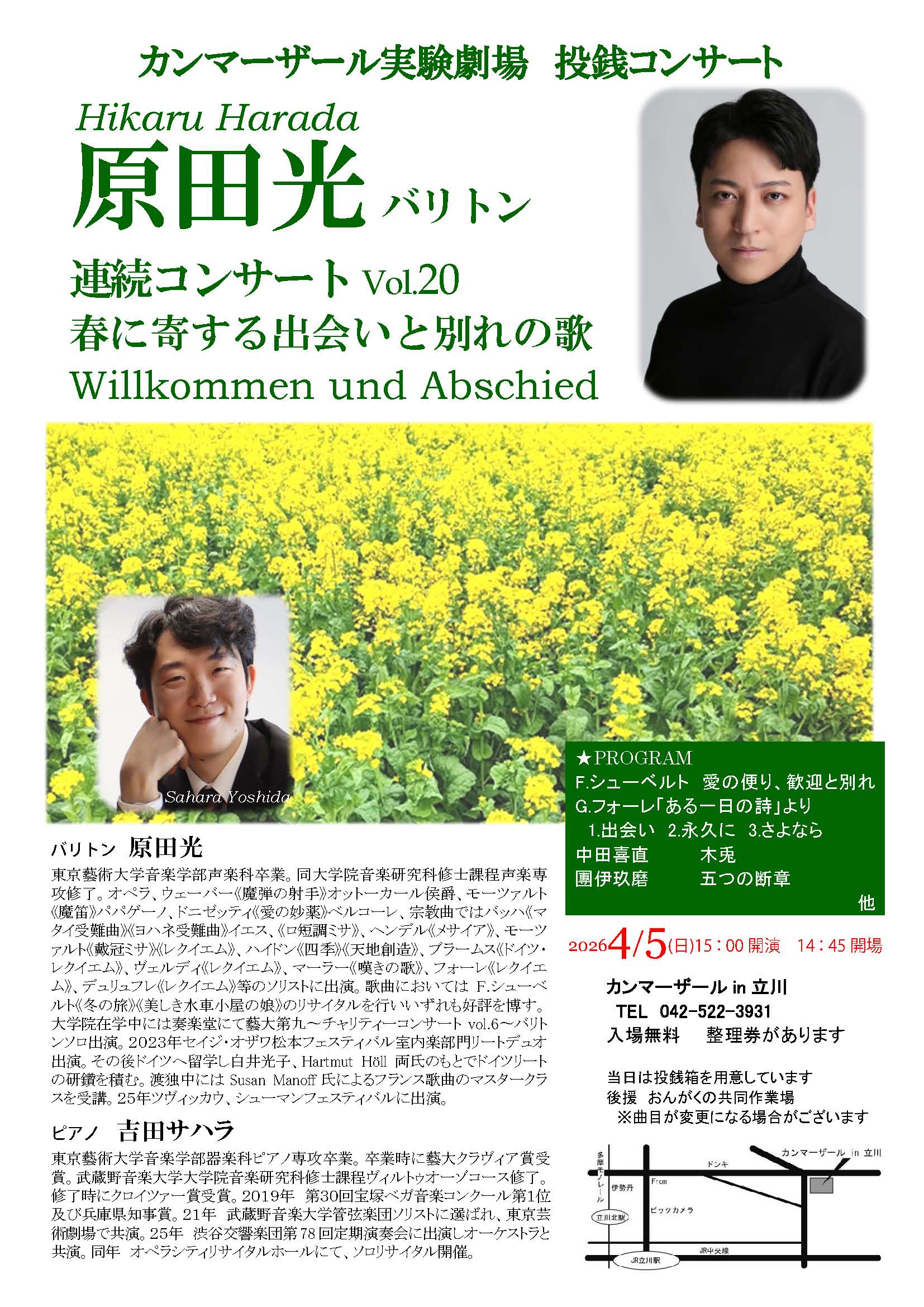 カンマーザール実験劇場 投銭コンサート 原田光 バリトン 連続コンサートVol.20~春に寄する出会いと別れの歌~