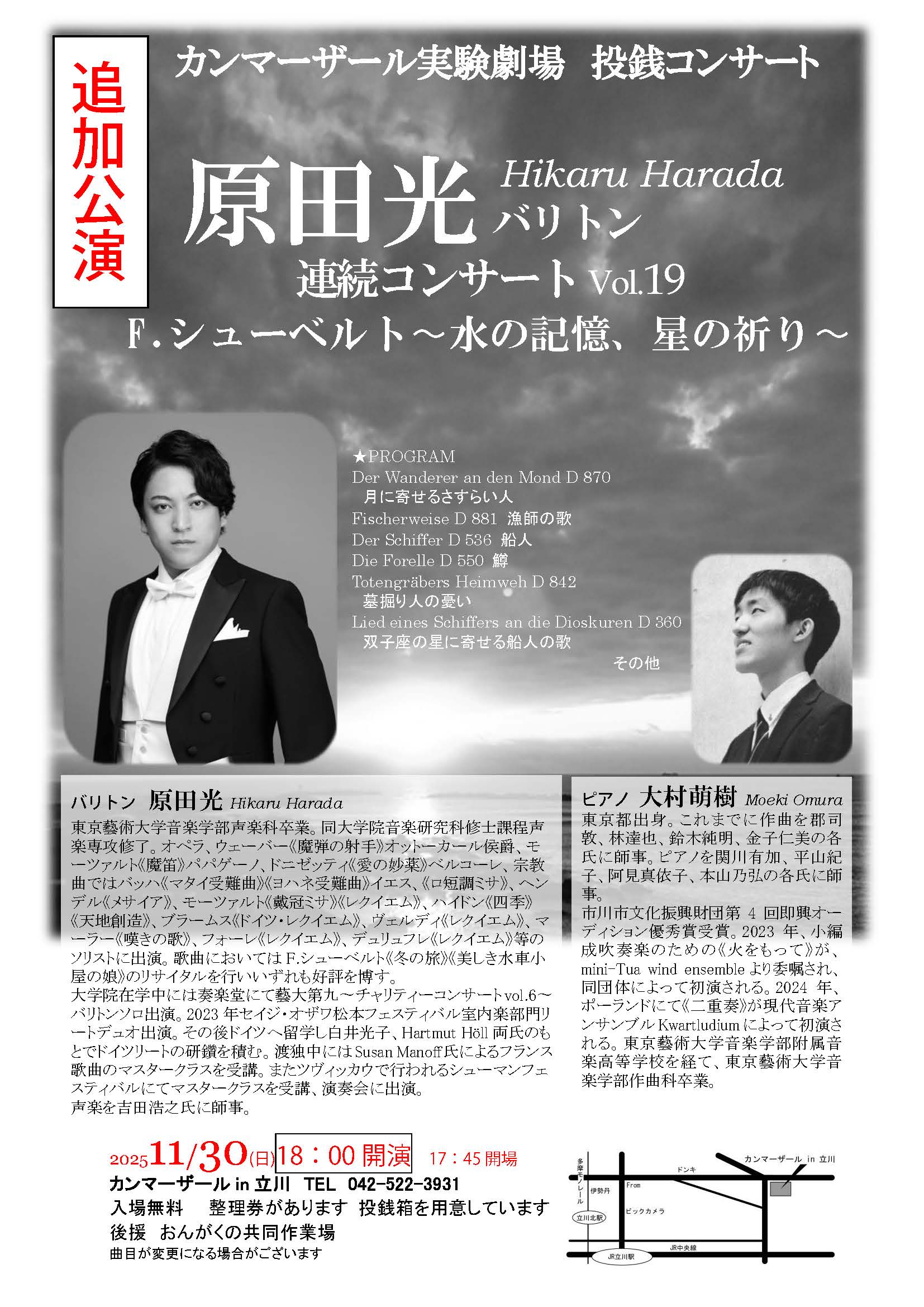 原田光バリトン連続コンサートVol.19F.シューベルト〜水の記憶、星の祈り〜 クリスマスコンサート~カンマーザール実験劇場 投銭コンサート~(追加公演)